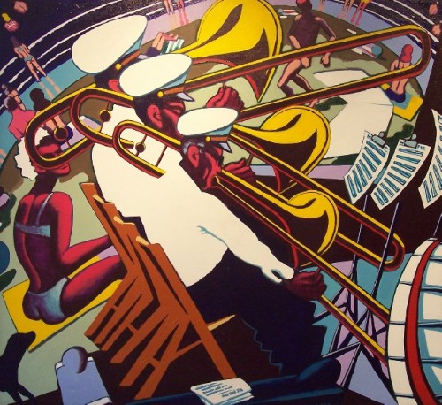 A much more abstracted form is Summer Band Concert. This is a large colorful visually musical painting. The artwork inculcates the vibrancy of a band concert, the passive and active park participants and the harmony of the band members. It is at once a geometric homage to entertaining music and park pleasures with the sweet and strong graphic memory of Lynn summers past.