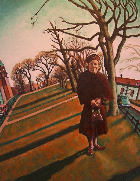 The third family portrait in the show is of Arnie's mother. She is an isolated figure set in a large neighborhood open space. Again, great affection for his mother is painted by the artist. But this painting asks more questions than any of the others. Why is the middle age figure set so alone? Is she lost or found in the openess of the space? The landscape falls away; the pathways elongate. She is small while being meaningful. But is she meaningfully small? Strong? Purposeful? Or what?