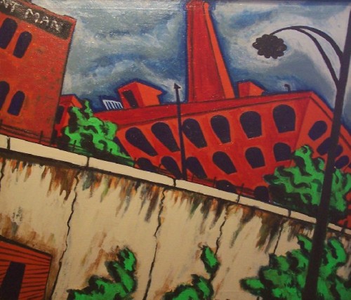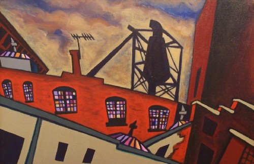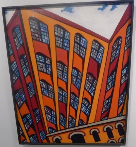 Each of the other paintings in the exhibition are portraits of buildings or sections of the former industrial city in decline. The angularity and coloration of each painting gives them a personality, a structural character. They are emotionally expressionistic. There is a joyfulness to theses cityscapes, a memory of past strength and declining dignity. The strongly rendered Shoe Factory underscores this notion of industrial social history and community connection.