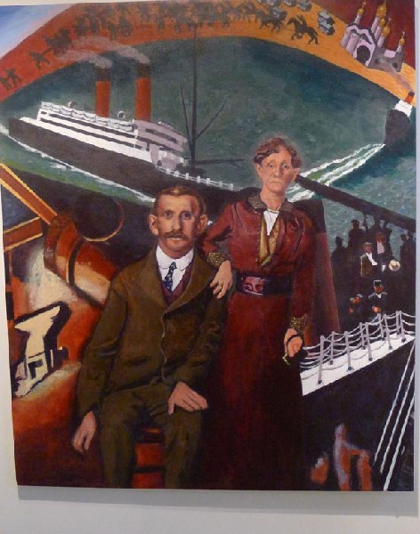 Another poignant portrait is My Maternal Grandparents: Crucible. Here Arnie's Eastern European immigrant grandfolks are formally arranged like an early 20th Century photograph but with a difference. In the background of the paintng, there are elements of their lives including a landscape of where they came from, a bit of Lynn and the ship that brought them to America and a new life. Their voyage was most probably in steerage far below the upperdecks.