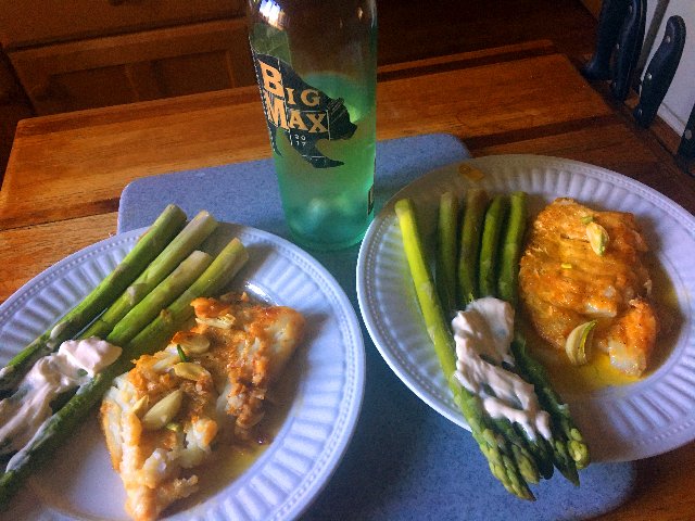 Take out if the oven and serve with the asparagus. A Sauvignon Blanc pairs well with this dish.