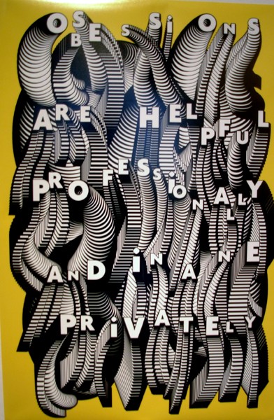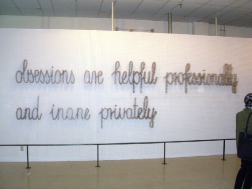 For the Biennale the renowned Austrian designer, Stefan Sagmeister, contributed the phrase "Obsessions are helpful professionally and inane privately." It was taken from a diary that includes some 20 maxims "Things I have learned in my life so far." Artists were invited to submit design proposals and a jury selected the room filled with responses to the phrase. Of these the most engaging was a wall with the phrase spelled out by projecting bamboo sticks. More variations will occur during the run of the Biennale.