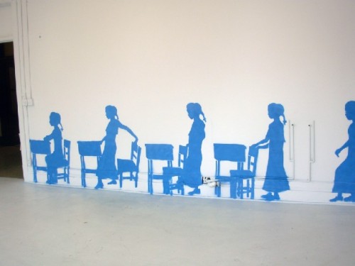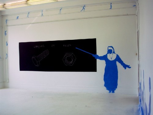 The project of Peter Gibson, or Roadsworth, was simple, clever and successful. The artist is known for stencils on sidewalks and aspects of public art, which is to say, not in galleries. He took the notion of the Biennale as located in an abandoned school and brought back the students. They are stenciled on sidewalks on their way to school, on the walls of the stairwells, along the corridors, and finally, in the classroom. Next to the blackboard is a stencil of the nun/ teacher with her pointer. On the blackboard is a parody of sex education as the nun appears to be lecturing on the function of a nut and its bolt or male/ female connections.
