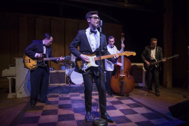 The other Crickets are also fearsome musicians. Shaun Whitley as Joe plays upright bass (and also climbs it in the finale). Kieran McCabe as Jerry is a fierce drummer. And Tommy (Michael Mahler), who joins the band later, is a sterling rhythm guitarist as well as the production’s music director.
