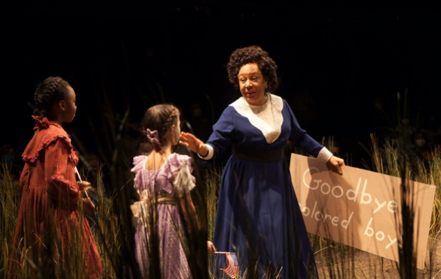 The play is not without its invitations. Relationships among Julia and her neighbors are richly realized, each woman having her own character and her own issues. Each and every actor gives special meaning to their role. Brittany Bradford as Julia Augustine is memorable in her rosy softness as she sings “Jacob’s Ladder,” dancing with her neighbors and particularly when she is wrapt in the love of her ‘husband.’ Elizabeth Van Dyke, familiar in her one woman show on Zora Neale Hurston, is now the landlady,/usiness woman of the group. You've never seen such a variety of bustles and pirouettes as her high stepping busyness. Her character has ingratiated herself with the white community. She has no problem bowing and scraping because she can get what she wants. Mattie (Brittany-Laurelle) cannot read. The relationship between her Black daughter and her young white charge dances over the thrust stage, illustratieing without words the heart of the racial problem in this country: White children grow up loving Black people until adolescence makes their separation necessary.
