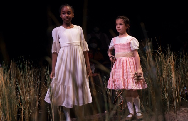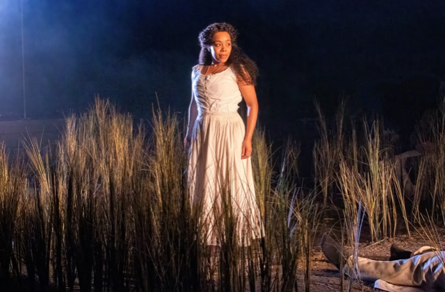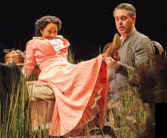 Tall stalks of slim grass line the stage on two sides. Often we look through them, curious guests, as the action unfolds. Jason Ardizzone-West has designed a space to invite intimate involvement with an uncomfortable tale. Qween Jean’s costumes swirl before us. Julia changes garments before our eyes. Sofie Nesanelis, the small white princess who plays with her Big Mamma’s daughter, changes into a classic sailor dress, punctuating her privileged position and also the war going on in the wider world. A door-to-door bell salesman (Max Woertendyke) whose bouncy sales joy is filled with exuberant gestures, is accented with suspenders and high socks.