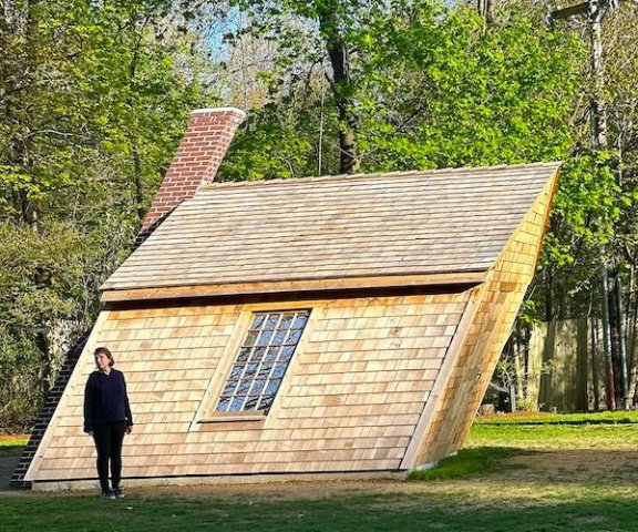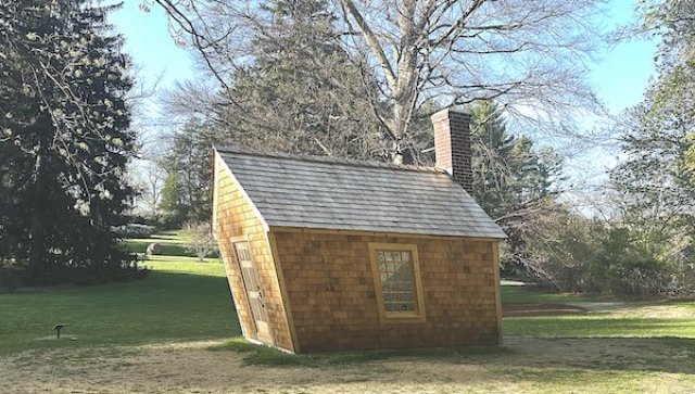 Created by Texas-born and New York-based artist Hugh Hayden (b. 1983), it is a 15 x 10’ significantly slanted (20% angled) one-room English style house, a visual — but significantly symbolically distorted — full-scale copy of Henry David Thoreau’s temporary dwelling that he built near Walden Pond. He lived, wrote, and entertained there for two years, two months and two days from July 4, 1845 – September 6, 1847. There is an exact copy of the original Thoreau house located about a mile and a half from the DeCordova on Massachusetts Route 126 near Walden Pond. There are also several similar replica Walden Pond houses located around the United States including in Pennsylvania, North Carolina, Virginia, and New York.