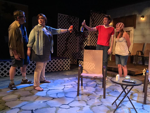 The action plays out on scenic designer Alyiece Moretto’s realistic rendering of the setting. There’s the exterior of Bob and Jennifer’s home, which looks like it could use a paint job. Meanwhile, separated by a white fence, we see the fresh interior of John and Pony’s home, into which they’ve just moved. It would have been nice, however, to also be able to see the interior of Bob and Jennifer’s home for comparison purposes.