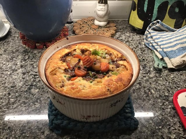 In a large skillet cook beef and onions til meat is brown, add veggies, potatoes, gravy and water, stir and add Worcestershire sauce and herbs, stir. In a 9-10in high sided baking dish place butter and put in oven. Meanwhile in small mixing bowl combine milk and eggs then add flour, salt and pepper. Beat til mixture is smooth. Remove dish from oven when butter is melted. Pour egg mixture into hot dish. Spoon meat mixture evenly into dish keeping it about 1 inch from the edge. Return to oven. Bake for 25-30 minutes til browned and puffed. Heat second jar of gravy to serve with the meal.