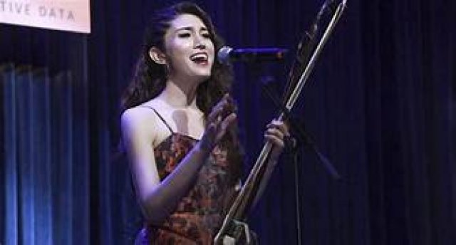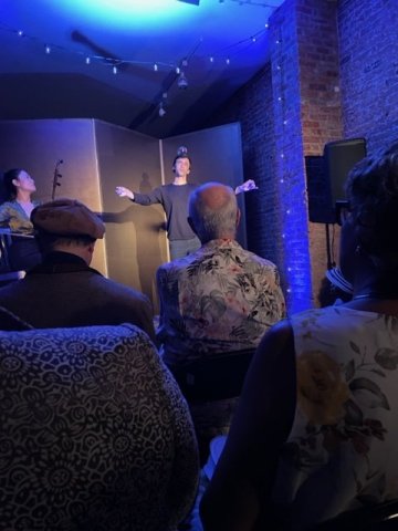 As the evening begins, Feifei Yang mounts a stage area tucked into the Front Gallery. She performs for a few minutes on the erhu, an instrument of the Hu people. The erhu has two strings and is a spike fiddle, whose special sound is created by python skin.