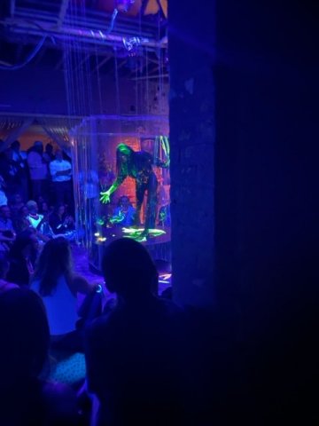 In the Clearlight Room, a large space that is used for concluding performances, Ricardo Romaneiro sits at a piano keyboard connected to electronic sounds. Iconic dancer Katherine Crockett, a Martha Graham dancer, is swathed in gold and wears a molded gold mask that slips on and off.