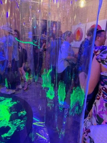 During cocktail hour, in a small room connecting the Sunken Garden space and the Clearlight Room, where the second and third events of the evening would take place, blank canvases hang on the wall and paints with brushes invite on a table beneath them. This is a prelude to a live painting experience that would have intrigued Jackson Pollock. Two rooms serve as galleries for the artwork of Carlos Mateu and Peter Sealy.