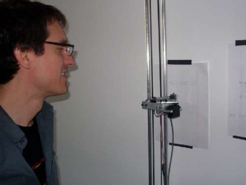 The artists in the Montreal Biennale have been pulled together into a matrix whose shape reminds us directly of this scientifically inspired procedure. One very good example for instance, is the wall-based, mechanical writing machine piece "Read/Write" installed on the second floor of downtown Montreal's historic Bourget Building, the site of the Biennale this year by Mathieu Bouchard and Alexandre Castonguay. It works interactively; the audience programs it with phrases of their choosing, and it writes their messages on the wall. Visually the result is quite surprisingly spectacular; ghostly, not a little unsettling but somehow intimate, clearly a statement of intellectual egalitarianism.