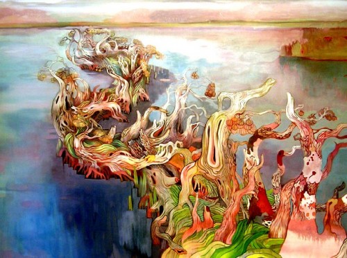 Another good example of openness as demonstrated by artists, in the best sense, is the collaborative installation called "Soundscapes", organized by Claudio Marzano and Scott Clyke, and also on the second floor (of three). In it, a musical composition inspired by Rick Leong's beautiful painting "Dancing Serpent in Dawn's Quiet" plays, in the company of two other of Leong's large-scale, atmospheric dreamscape paintings