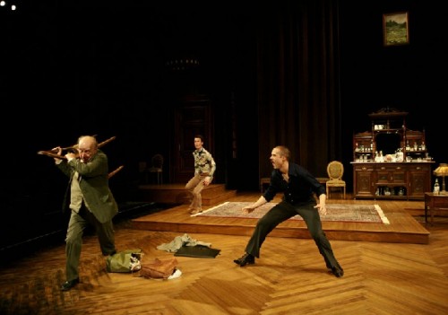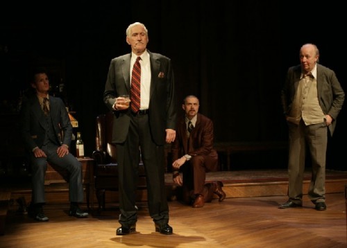 The apparent mistake of attending a Pinter play is to search for meaning or resolution. His work defines the notion of the absurd or stands against interpretation. This play much recalled the earlier ART production of "No Exit" by Sartre. But it was less stridently obvious as an exposition of theory and philosophy. Clearly Sartre may be the more profound thinker but Pinter is primarily a greater artist. There are many obvious parallels. In this case Hell as an upscale British apartment from which there is No Exit. Spooner, at the beginning of the second act, for example, asks Briggs (Lewis D. Wheeler) one of two handsome young thugs who are well paid retainers of the besotted Hirst, why he had been locked in the drawing room over night? Spooner, now sensing foul play as the situation grows ever more dark and ominous, tries to slip away to a fabricated, urgent, appointment. But Briggs sees through it and bars the door. Once in this incubator of agita there is no way out.