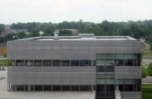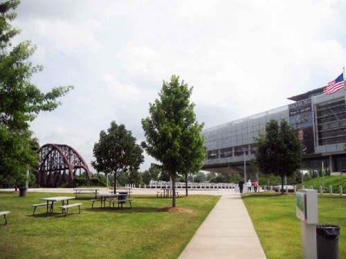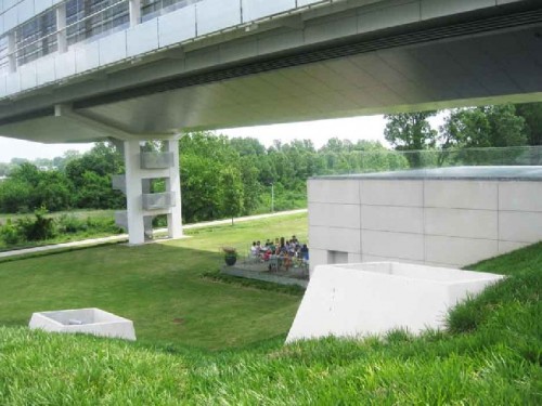 One end of the box like structure cantilevers stretching toward the banks of the Arkansas River. Just beyond, literally, is an old railroad bridge. It conveyed passengers to a depot which is now home to the University of Arkansas Clinton School of Public Service.
