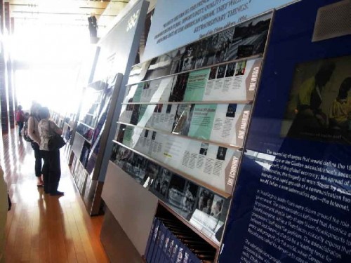 The well organized and straight forward thematic installations have been designed by Ralph Appelbaum Associates. We experience the full range of a rich and complex life from nude baby pictures to Bubba outfitted in the high school marching band. There are shots and memorabilia of early campaigns including one for Student Council. A photo of the young Bill and Hillary reveals the kind of long hair he sported during an era when he didn’t inhale.