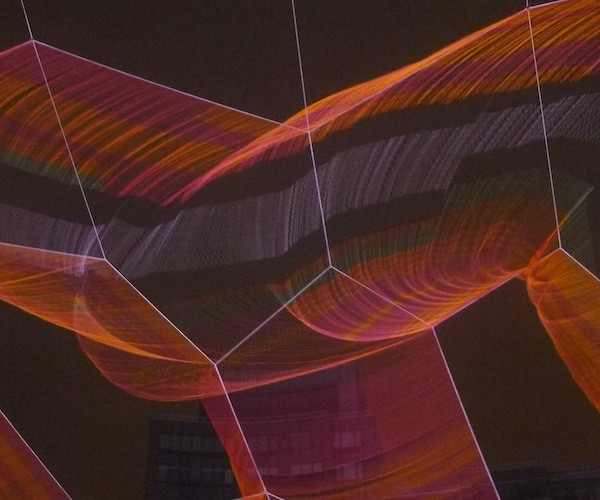 Fabrication of the sculpture was made by hand-splicing rope and knotting twine into an interconnected mesh of more than a half-million nodes. The structural rope fibers are 15 times stronger than steel yet quite lightweight. This flexibility allows the sculpture to be strategically laced directly into three skyscrapers at four points of tension. Visually, this arrangement supplies a soft counterpoint to the hard-edged surrounding architecture.