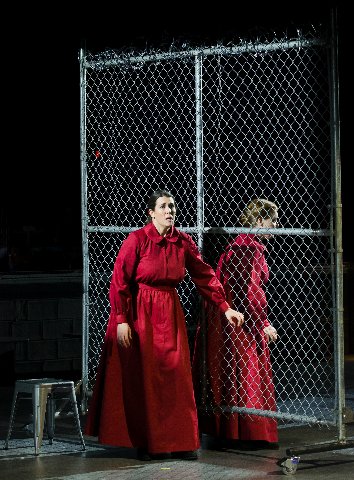 The opening performance (May 5th, at Harvard University’s Ray Lavietes Pavilion ) of the Boston Lyric Opera’s original adaptation of Margaret Atwood’s dark, dystopian novel, “The Handmaid’s Tale” had by coincidence found the site – Harvard campus – where the author had originally planted her masterpiece of a brutal authoritarian society. With the physical stage re-imagined onto a basketball court, as an imprisoned space with the performers then blocked by the infamous “wall” on one side and then surrounded by an audience in bleachers, there was an immediate intensity. The impact, according to associate producer, Julia Noulin-Merat, was “for the experience to start the moment the audience enters the space.”