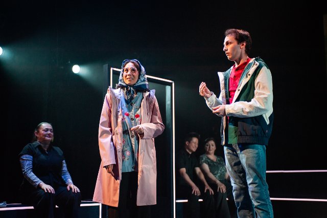 In keeping with Christopher’s compartmentalization and disruptiveness, the action is divided into 57 fast-moving scenes, though a few seem unessential and slow the action. Actors remain on stage most of the time and move frequently in lockstep and other times organically to Bridgette Loriaux’s brilliant movement direction. James Ard’s sound design is pervasive and marvelously detailed from musical blipping to the faint sound of a toilet flushing. This all plays against Bill English’s minimalist but powerful right-angled set framed by light strips and accented by Christian Mejia’s lighting design. On the back wall of the stage, and in keeping with the angular look, Sarah Phykitt’s linear-graphic projections visually reflect Christopher’s mind which favors predictably organized things like computers and machines.