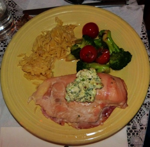 Then I got the chicken cordon bleu. The waitress understood the problem with the stroganoff. She apologized and let me order another entrée which was served as soon as possible. I was also comped for a dessert. That was the proper protocol.