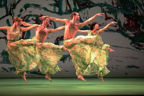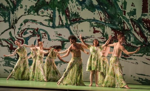 Morris’s nymphs and shepherds are all young, slim and lithe – they’re dancers, after all. Dressed by Isaac Mizrahi in loose, gauzy pajama-like costumes with abstract green, white and faded red patterns that look like the sun shining through dense foliage, the men shirtless, they embody a natural innocence that embraces a happy sexuality. They suggest a model for our own behavior, so often degraded by fear, hate, greed, jealousy, etc. - the seven deadly sins multiplied these days by cyber-digits. Morris and his company of happy rustics – like Robin Hood and his Merry Men (and Women) - remind us of our better selves. All for one and one for all. Walking, running, skipping, jumping, falling and rolling on the floor, occasionally lifting one above the others, they propose a new, but ancient, model of behavior, in which all are equal, but all are individual. You can see it in the variety of the male dancers’ facial and chest hair.