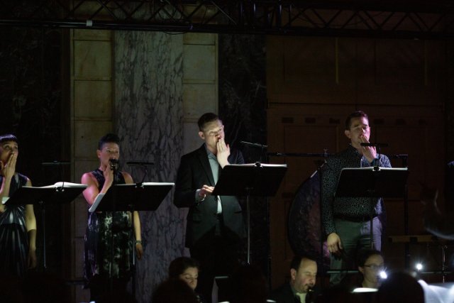 Many languages are sung, French, German, and a Made-Up-Language by the composer. Gutterals and lyric vowels were intriguing and fun to hear. Bass Steven Hrycelak was particularly pleasing as he growled and bleeped like R2D2. In fact all the singers gave varied interpretations to text and to the journey. Kirsten Sollek had a lush contralto. Baritones Christopher Herbert and Joseph Beutel tred a daring line between speech and song. Amy Goldin, Katharine Dain and Hai-Ting Chinn colored their probing trip into space with often all-encompassing sounds.