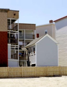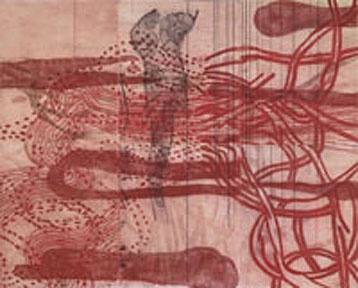 The Annuals always seem to have some regular categories: New media (this year weakened because its curator, George Fifield was sacked), craft, and photography. Nick Capasso is a specialist in sculpture so this is always a part of the mix. But of course in a show such as this with its mandate for "the best" and cutting edge you can't just do straight craft and photography. True to form, it is presented here with a twist. Nathalie Miebach makes over the top baskets. And Elke Morris blurs parts of her images of working class housing in Lewiston, Maine with Photoshop to make them more, well, artsy. Oh yes, and Sarah Amos states that "In the fall of 2005 I began researching the work of Utagawa Hiroshige, a Japanese printmaker who made a series of 53 exquisite landscape woodcuts called the Tokaido Highway Series 1834." Her work, I guess, reflects that.