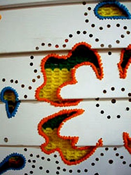 There is another difficult, challenging nook and cranny in the eccentrically designed museum. This is the narrow, curious space next to the large window above the main entrance. Again, this has been a challenge for an interesting series of artists and the solution here by Samantha Fields is quite charming and wonderful. She has configured it into a folly of the most girly, fru fru, layers of curtains on lacy curtains. That's over the window and in the short space facing it is a wall with aluminum siding which has been customized with a pattern of cutouts with embroidered edges. I don't know what it means but it is interesting and fun to look at.