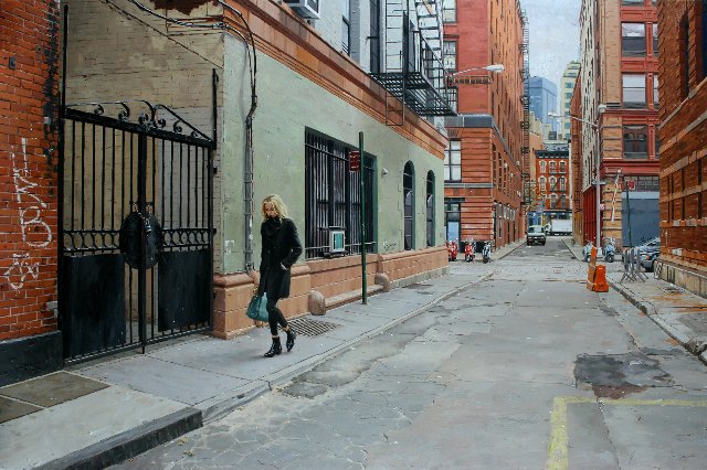 Vincent Giarrano’s paintings are like memories of the faintly familiar. Each is an ordinary scene in an urban landscape…private and enigmatic moments. The artist’s compositions seem almost cinematic, with an unfolding narrative suspended on a single frame of film. Giarrano is a storyteller much like a movie or stage director who creates a mood with dramatic lighting, visual props and cast members bringing a script to life.