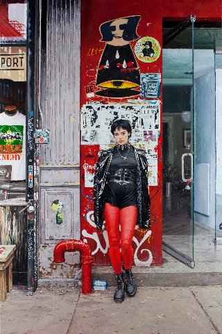 The model in “Disorder” is a bit more punk and edgy in red tights, butch boots and leather. Here the urban graffiti seems more connected. But the artist seems only to be interested in attractive young women, arguably, above his fantasy pay grade. Or that of the collector. Other than the look the women convey no life experience or character. They are strictly mistress or second wife material for the targeted arriviste collector. Think Hef or Bob Guccioni.