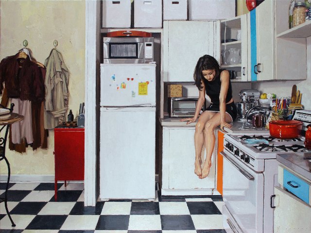Let’s phase out with “Bora in the Kitchen” which is a hoot but a bit of a bore. Vermeer rendered sublime working girls in interiors. There is perhaps a hint of that as the artist gives us an upskirt view of a model sitting on the edge of the kitchen counter. Gairrano has gone all out rendering appliances. That includes the stove in perspective with a red enameled Dutch oven on top.