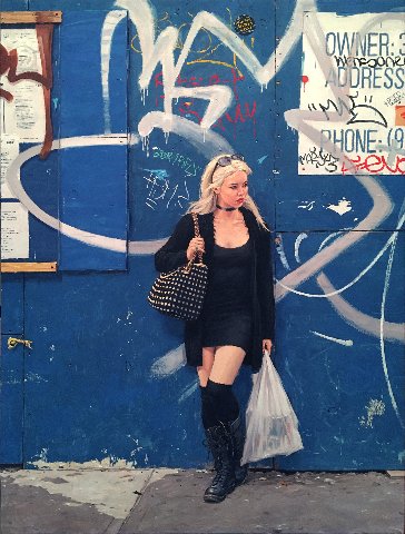 We have another young woman in “Lauren and Grafitti.” Her black outfit, short skirt, jacket, boots and high stockings contracts with blonde hair and soft pale skin. The young beauty is accessorized with a black choker and sunglasses forming an ersatz tiara for an urban princess. She has a studded large bag over a shoulder and is holding a plastic shopping bag. Given her chic demeanor the graffiti is a non sequitur.