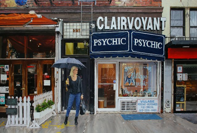 The painting “Clairvoyant” is a tad more complex. There is a double sign “Pshychic” projecting in a V formation from the front of a storefront. The lady in question holds an umbrella. Has this rainy day fashionista emerged from the shop? Is she hailing a cab having spun the bottle? This is the "cinematic" element that Kemp references. Compared to the establishing shots of Damien Loeb, however, Giarrano's depicts a B-movie.