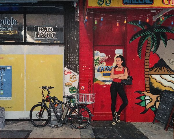 We find a young woman propped against a wall in “Outside Arlene’s.” She has, shall we say, attitude, in a street sense. She is standing outside a bar next to a bicycle. What’s with the bike other than something to render and perhaps dazzle the viewer? I haven’t a clue what she’s about nor do I particularly care.