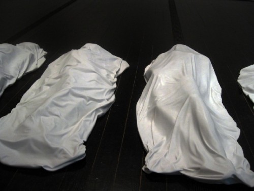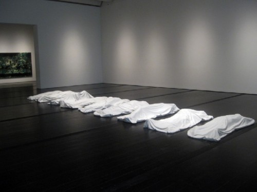 From the Horse we continued into the modern and contemporary galleries which comprise roughly half of the museum. There was a large gallery with a row of “victims” of an unidentified disaster. The dead bodies could be made out through the contours of the shrouds that covered them.