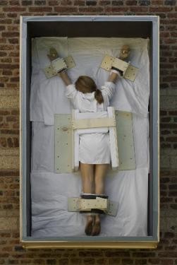 Turning a corner in a medieval gallery there she was. A strikingly beautiful figure of a woman crucified and strapped down in what appeared to be a shipping container. We did not see her face but speculated on her beauty based on realistic blonde hair and the agile figure of a young woman. Again, was this act anof a serial killer? Perhaps an example of extreme bondage? Were we meant to evoke sympathy, empathy or erotic arousal? It was the second piece in the suite that evoked crucifixion and its obvious religious reference. What is his hang-up with Jesus?