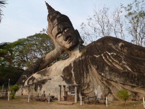 A highlight was our visit to the Buddha Park, about 16 miles southeast of the city by the Mekong River. The park, also known as Wat Xieng Khuan, or the “Spirit City,” features a collection of over 200 large concrete Buddhist and Hindu sculptures amidst frangipani, the national flower of Laos. It was built in the1950s by a shaman priest, who merged Hindu and Buddhist traditions to develop a following in Laos and Northeastern Thailand. The numerous figures include images of Shiva, Vishnu, and the Buddha, as well as humans, animals, and demons, giving the place an air of fantasy. There is an enormous reclining Buddha, which is over 130 feet long. Dominating the park is a pumpkin-shaped massive structure with three levels, representing hell, earth, and heaven. It offers a good view from the very top, which is reached by a staircase inside the gigantic mouth.