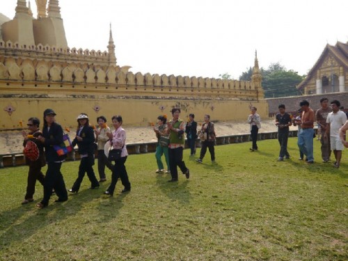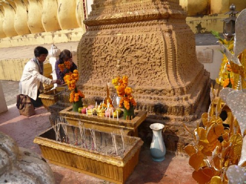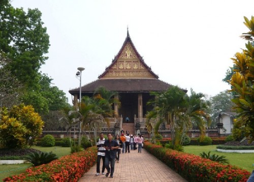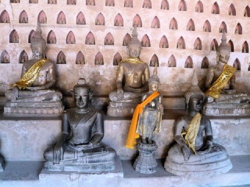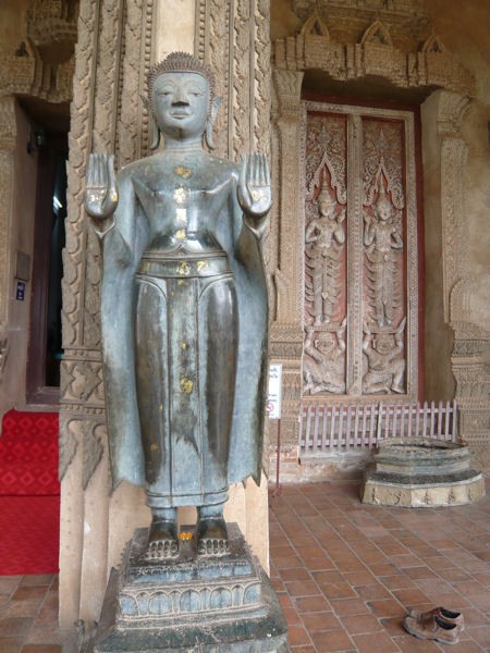 Our tour began in a neighborhood which was once the administrative center of French colonial rule. The Presidential palace, originally built as the French colonial governor’s residence, is now used for hosting foreign guests of the Lao government and is not open to the public. Nearby is the royal and Buddhist headquarters. Haw Pha Kaew is the former royal temple of the Lao monarchy, built in 1565 to house the Emerald Buddha, which was brought to Laos from Thailand. Today the Emerald Buddha is back in Bangkok. The building, no longer used as a temple, has been restored; its two main doors contain remnants of wooden panels from the original structure. The museum has famed Buddhist sculptures of the types common in Laos. Its beautiful garden is a peaceful retreat from the dust and heat of Vientiane.