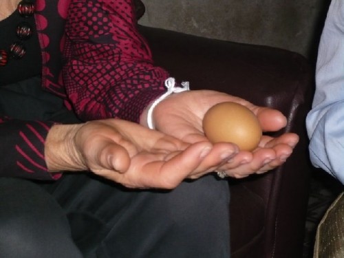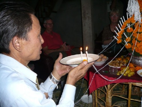 In the same village we visited a local mor kwan (a shaman), to participate in a traditional Bai Sri Su Kwan, or rice-offering ceremony. Shamans are certified by the government and must display their certificates where they practice. We were received in a room with two framed certificates on the wall. We sat facing an altar prepared with flowers, candles, and food: hard-boiled eggs, small bananas, and banana and shrimp chips. Holding a lit candle in a plate in his hand, the shaman chanted in a Lao dialect, while we held on with both hands to white cotton threads tied to the altar. When he finished chanting, the shaman put a dab of rice wine in both palms of each participant’s hand, followed by an egg, and tied a white piece of thread around one wrist to be kept there for three days. Thus, we were all blessed to have a safe trip and to keep all of our 32 souls with us.