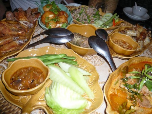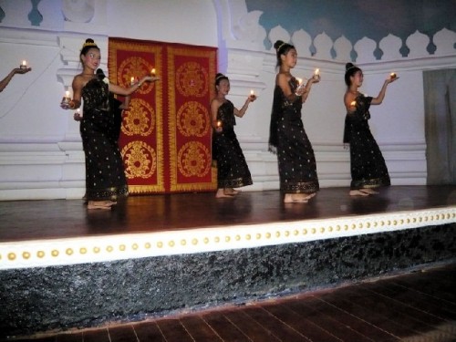 On our final night in Vientiane, we enjoyed dinner and a traditional dance show with live gamelan music at a downtown hotel. We checked our shoes with an attendant and sat on low floor cushions to eat. As in all previous establishments, the menu offered a great variety of Asian food; the program included both court and folkloric dance. The court dances were stories from the Ramayana epic, and the folk dances depicted daily lives, such as rice harvesting and fishing. Satiated both culturally and gastronomically, we returned to our hotel in anticipation of our trip to Vietnam the following day.