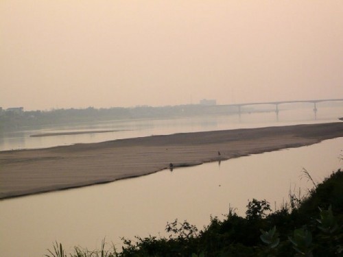 Our hotel, Don Chan Palace, faced a riverfront boulevard that ran right along the Mekong at the southern edge of the town. Vientiane owed its early prosperity to its location on the fertile alluvial plains on the banks of the Mekong River. The river is lined with reinforced dykes and a town wall built against overflowing waters; massive construction to develop the riverfront is ongoing. Many outdoor cafes with a view across the river to Thailand offer food, fruit shakes, and beer. Due to the intense heat in the high 90s, I opted, regrettably, to stay in the air-conditioned hotel during our free time, rather than exploring the waterfront.