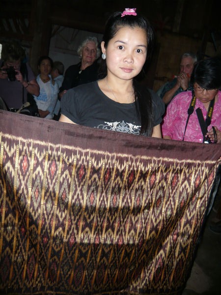 On the way back from the park, we stopped by the river shore to see the Thai-Lao Friendship Bridge, completed in 1994 and funded by the Australian government. The bridge, which is ¾mile long, connects Nong Khai in Thailand to Vientiane, and is symbolic of the opening of Laos to the outside world. Continuing on to a weaving village, we admired silk shawls with traditional designs woven on hand looms with tie-dyed silk threads.