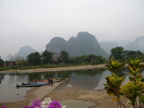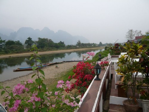 Continuing on a mountain road, we reached Vang Vieng, our overnight rest stop on the way to Vientiane. Vang Vieng is nestled in mountains, and its scenic surroundings are renowned for their topography. Trekking attracts backpacking crowds, who sleep in places charging as little as $4 a night. Even restaurants offer reclining chairs as rest stops. There is also drug activity here; trading in drugs is illegal, and anyone caught with more than 500 grams of heroin faces a penalty of a very long jail term or even execution.