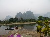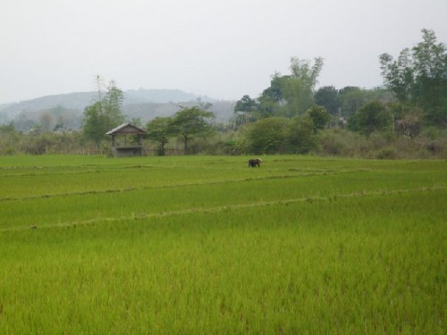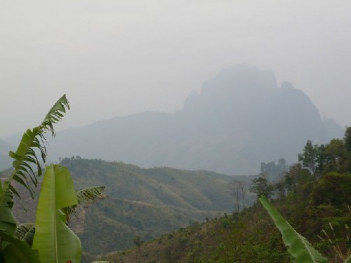 Descending a road flanked by charred ground and blackened hills, we passed by workmen laying cable for telephone lines. Passing store fronts and an occasional motorcycle, we paid a toll to drive onto a paved road. Knowing how low salaries were, we suspected corruption at the sight of expensive cars. The landscape of surrounding hills was shrouded in smog. Villages with bamboo homes, laundry stretched between poles, and even big tour buses all appeared in silhouette. At 4500 feet we reached Phou (Mount) Khoun, where we stopped for lunch.