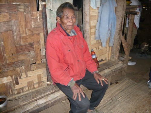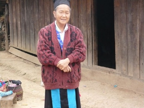 The Khumu people, related to the Khmer, are farmers; their major crop is mountain rice, as was evident from the surroundings. We entered the village on foot, noting a sign given by the government in recognition of the village’s no-crime record. People squatted around wood fires in front of their homes against the chill of the mountain air. Like the pied piper, we attracted all the village children with bags of candy in our hands. Congregating around us, they received the candy with happy squeals, piercing the calm in the air. People appeared happy despite the apparent poverty. We visited a 90-year-old village elder and learned about animist shaman ceremonies for driving away bad spirits and making offerings to appease them.