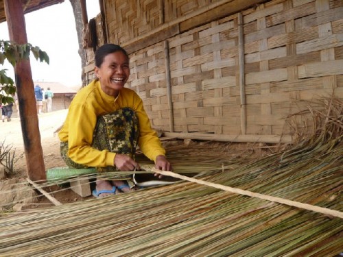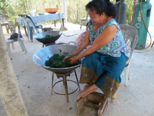 Organic produce is less expensive on this farm, as vegetables with holes in the leaves do not look as pretty as those sprayed with chemicals. We walked among mulberry trees, citronella plants, lemon grass, and hibiscus. We were introduced to jackfruit, which tastes like potato and can weigh up to 30 pounds; it is eaten chopped or mashed. We enjoyed mulberry tea made by boiling the leaves over a wood fire and chopping the upper layer for high-quality and the stem part for low-quality tea. In the final stage the leaves are tossed by hand to bring out the aromatic flavor, dried, and packaged. We sampled sun-dried banana chips and mulberry leaf tempura, which were both delicious. I purchased a bag of mulberry tea, in addition to a scarf from silk produced on the farm. The proceeds from purchases go to support an English school for the villagers, who come to the farm to learn “the way of the future,” as internet technology spreads throughout Laos.