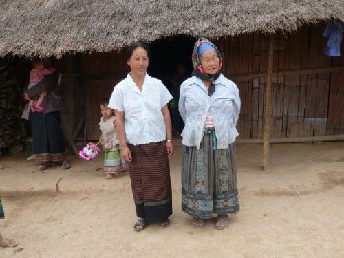 The government has put an end to nomadic life. Now everyone lives in a village with electricity. We also visited a Hmong village. As soon as our bus pulled up, children and adults appeared at the doorsteps of their houses, which lined a hill. We walked up to visit them. A widow who lived with her mother, six children, and six grandchildren welcomed us to her two-room bamboo house. Despite the crowd living in this small space, the house looked neat and orderly. Everyone seemed to have a designated area, including the family dog, who slept in a corner.