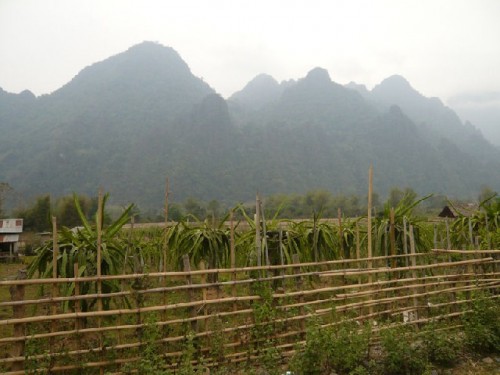 In the morning we were back on the mountain road with spectacular scenery. We passed by people cooking breakfast along the roadside. Students on bicycles — boys in white shirts with dark pants and short hair, and girls in white shirts and dark skirts — rode to school. We stopped to visit an organic farm. The founder had received his university education in Sophia, Bulgaria and later joined the pro-Communist organization known as the Pathet Lao to free the country of colonial powers. He had worked for the government in forestry; he then started the farm with two acres of land in 1996, gradually increasing it to five and then to twenty acres.
