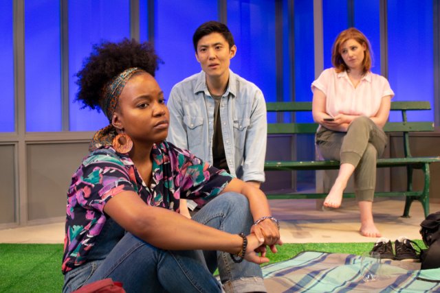 Low Power, by Jon Kern, directed by Kimiel Harris, wrestles with the barriers to love and marriage within the context of the ever present cell phones and the racial biases that frame the lives of Kyle (Fang Du) and Fabienne (Renika Williams). A picnic in the park with friend Amanda (Gillian Williams) is the scene of the couple's intimacy and estrangement, as they involve themselves more in their cell phones than in truly listening to each other.